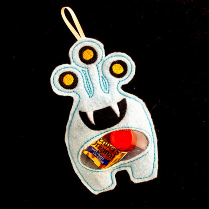 In-the-hoop three-eyed monster treat bag with window